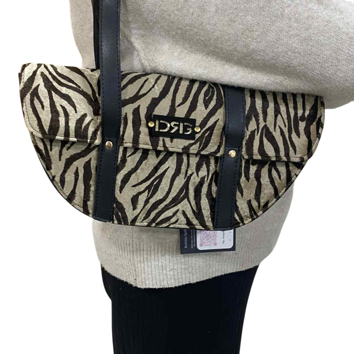 Η Zebra Curve της DRG είναι ένα έργο τέχνης. Μια τσάντα ώμου που ισορροπεί απόλυτα ανάμεσα στον μοντέρνο δυναμισμό και τη διαχρονική κομψότητα. Με καμπύλο σχεδιασμό, zebra βελούδινη υφή και διπλή δερμάτινη λαβή, είναι φτιαγμένη για να ξεχωρίζει – όπως και η γυναίκα που την κρατά.