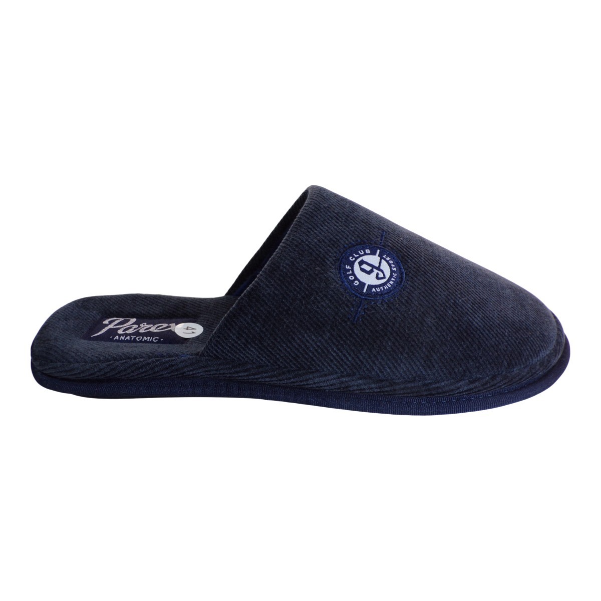 Ανδρικές παντόφλες σπιτιού . Γκρι και μπλε ανδρικές παντόφλες με κεντημένο σχέδιο και μαλακή επένδυση – ιδανικές για άνεση στο σπίτι.